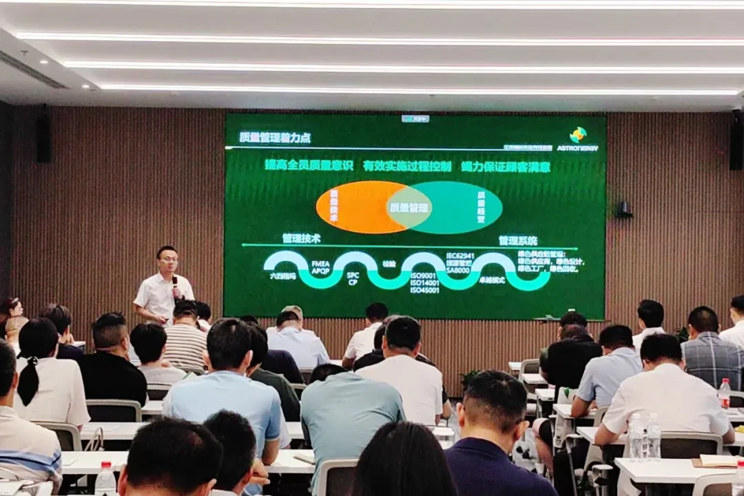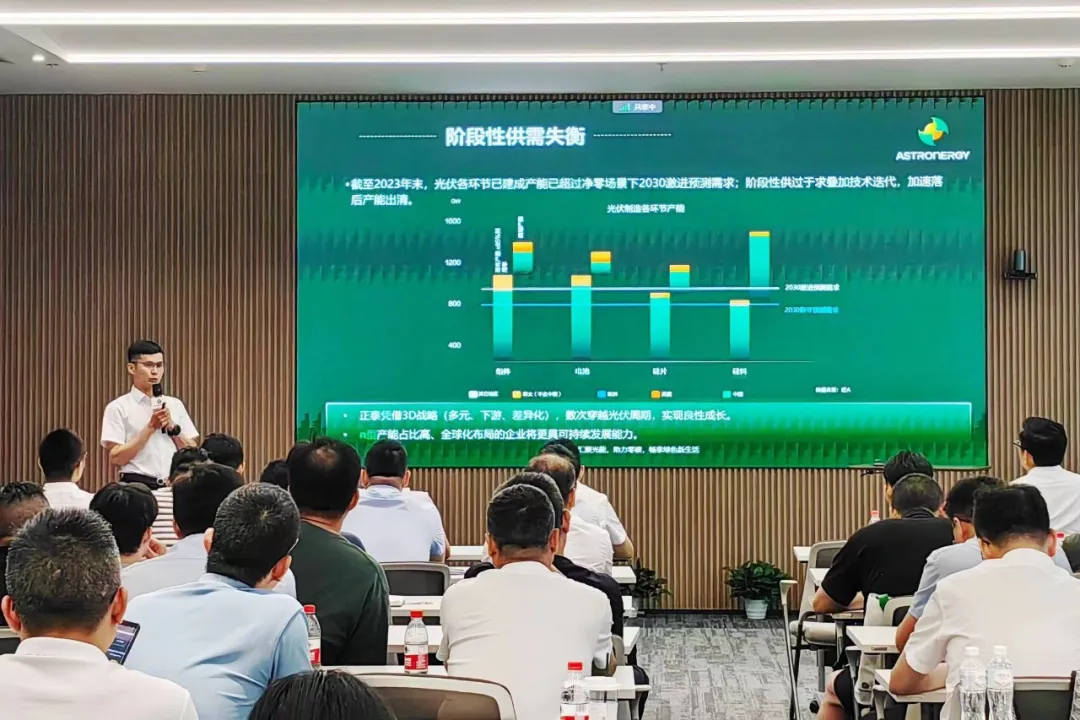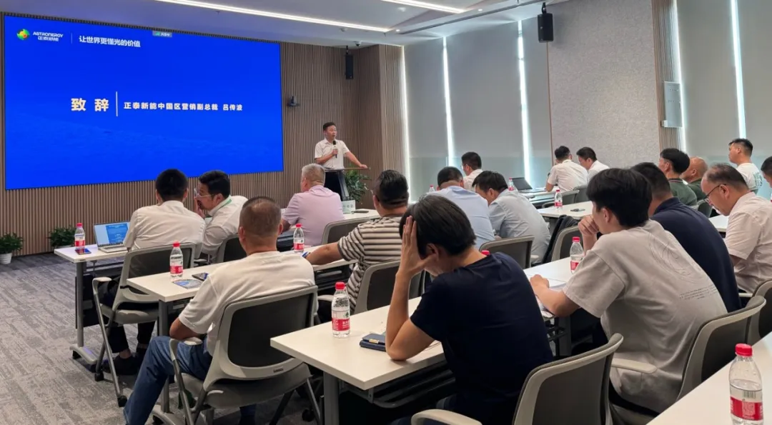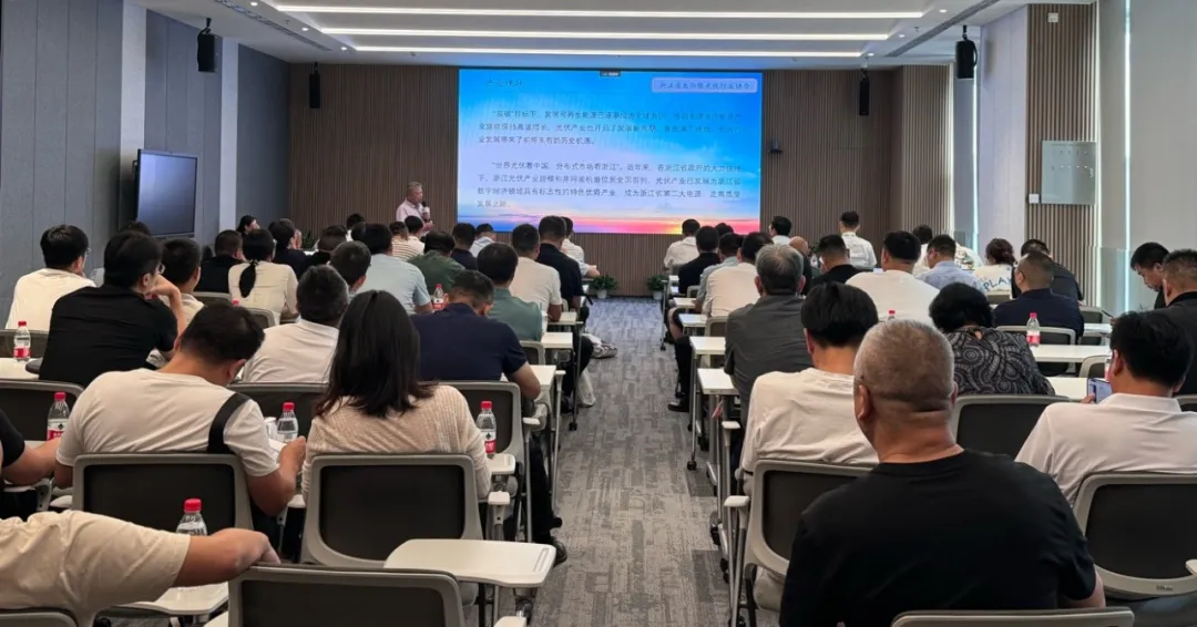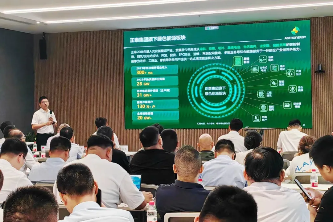 浙江省太阳能光伏行业协会秘书长沈福鑫,正泰新能中国区营销副总裁吕传波、智能制造区域总经理刘古岩、组件技术总监张光斗、全球质量保证总监甘海平、全球产品技术服务高级经理杨天峰等参与会议。