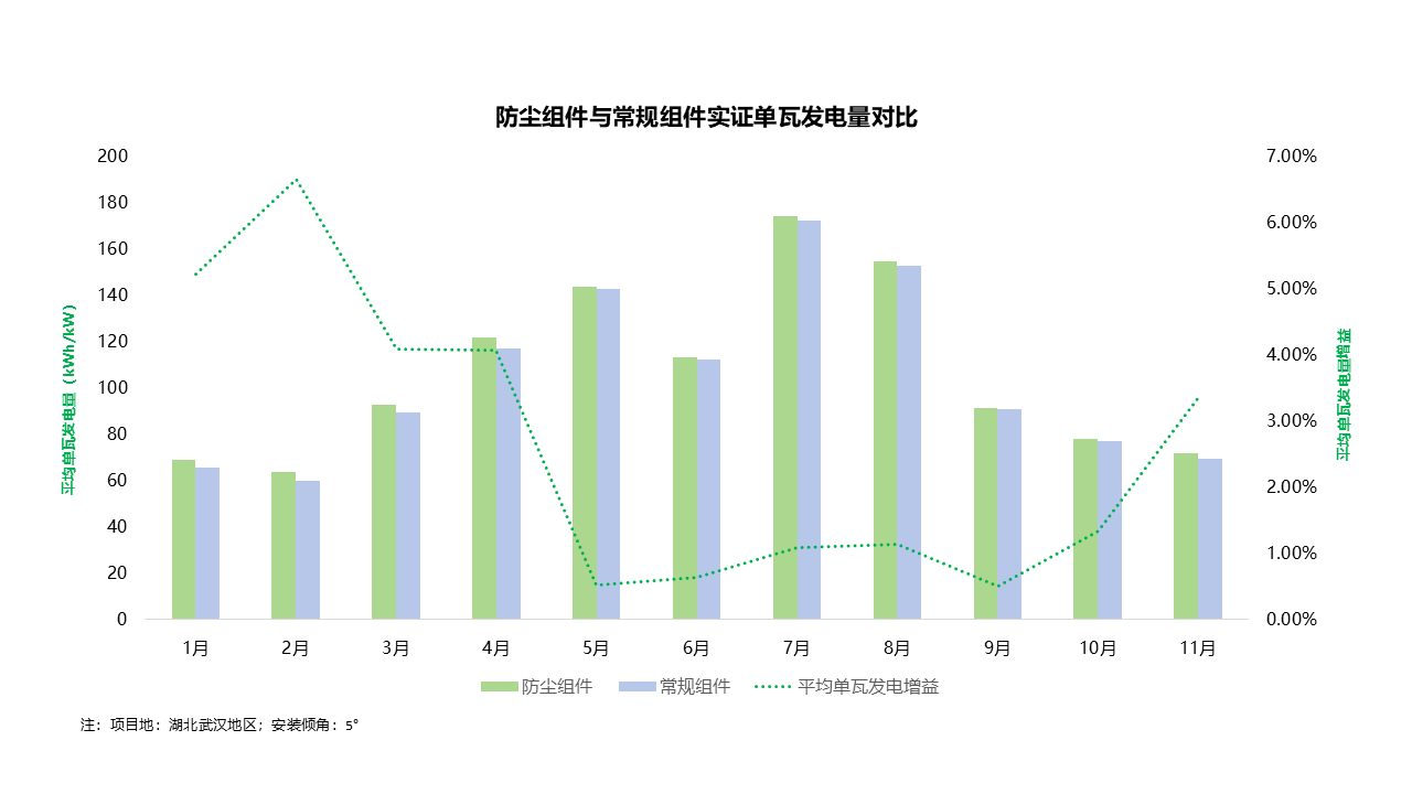 武汉地区实证数据表明,该防积灰设计可显著减少表面积灰,月均单瓦发电增益达2.59%,单月最高增益突破6.65%。