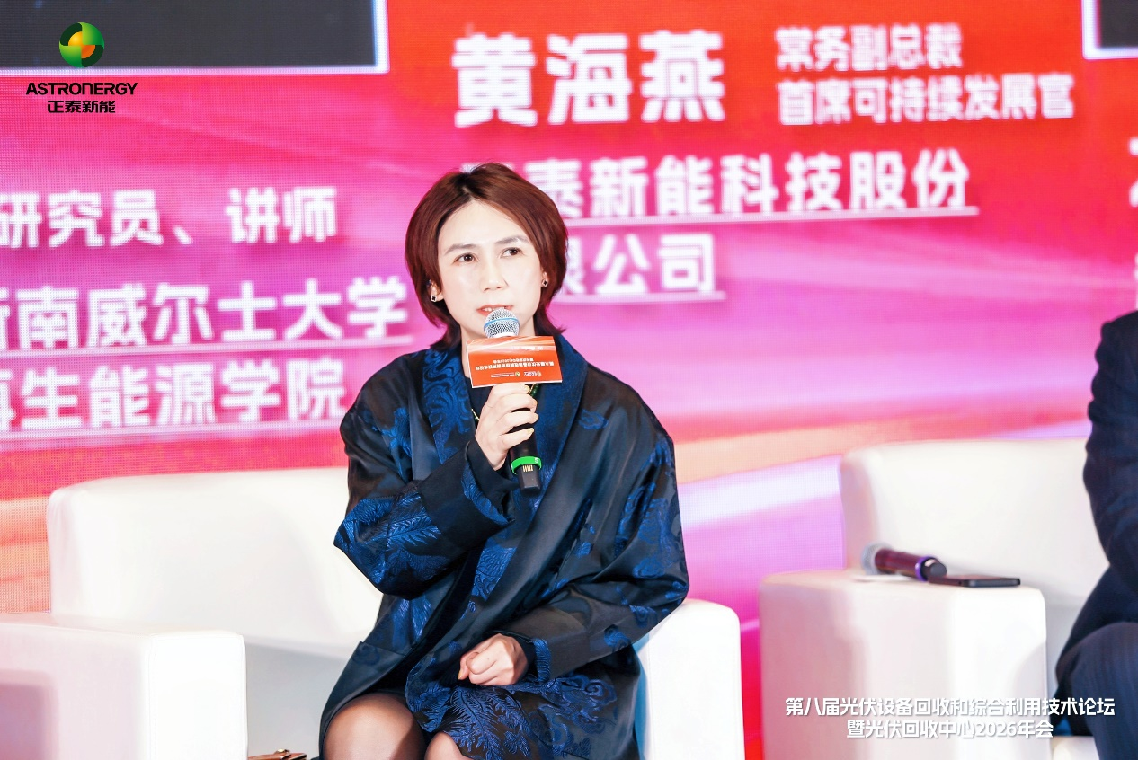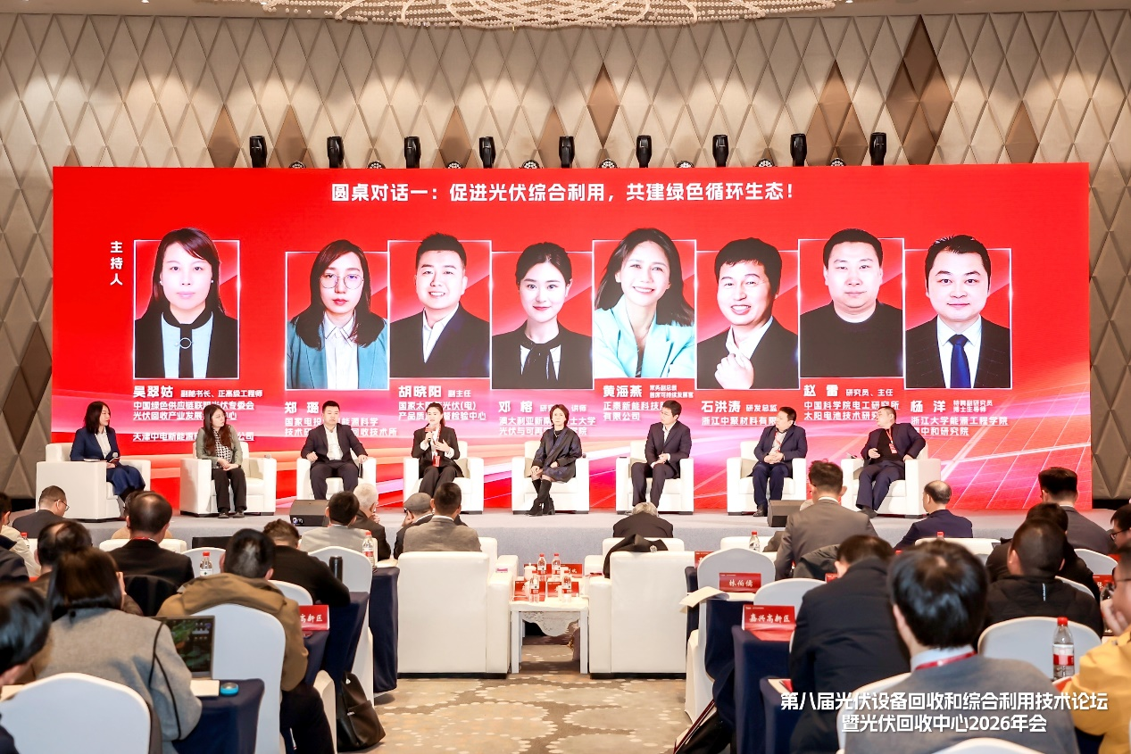 3月14日,第八届光伏设备回收和综合利用技术论坛暨光伏回收中心2026年会在嘉兴秀洲揭开帷幕。本届论坛以“蓄势·筑链·谋局——新起点下光伏回收和综合利用产业化机遇探索”为主题,汇聚了国内外产学研及第三方平台的专家学者,围绕宏观政策、技术装备、国际合作等议题展开深入交流。正泰新能常务副总裁、首席可持续发展官黄海燕受邀出席,并在圆桌对话中分享了正泰新能在光伏回收领域的前瞻布局与战略思考。