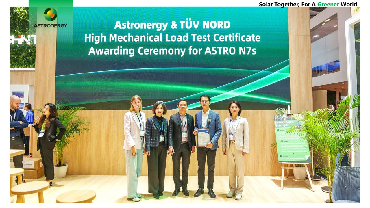 During Intersolar Europe 2025, Astronergy’s ASTRO N7s PV modules proudly obtained two certificates, including Vereinigung Kantonaler Feuerversicherungen (VKF) HW4 Hail Impact Test Certificate and High Mechanical Load Test Certificate from TÜV NORD with exceptional results of +10,000/-4,000 Pa. These two achievements highlight the remarkable resilience and reliability of ASTRO N7s in extreme environmental conditions.