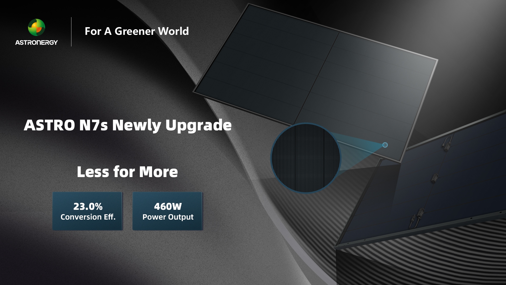 Con el objetivo de ofrecer a los clientes productos con menor impacto ambiental y más beneficios para la generación de energía sostenible, Astronergy acutalizó nuevamente sus productos residenciales - ASTRO N7s con un diseño más pequeño, esperando hacerlos excepcionales en el mercado solar residencial debido a su alta potencia de 460W, alta eficiencia de conversión del 23% y el uso de materiales mucho más ecológicos.